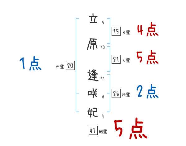 人運![]() | 立原逢咲妃さんの人運は21画の5つ星!統率力がある。独立し成功する。名誉を手に入れる。 性格や才能などを表す2番目に重要な運勢です。人間関係や協調性、社会的な成功に影響します。主に20歳から50歳ぐらいまでの中年期の運勢を表します。 |