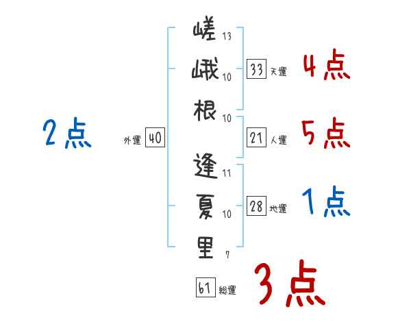 総運![]() | 嵯峨根逢夏里さんの総運は61画の3つ星!強情な性格でうぬぼれタイプ。自ら破滅する。 あなたの人生を表す1番重要な運勢です。生涯を通じて影響する総合運となり、主に50歳以降の晩年期に影響を及ぼします。 |