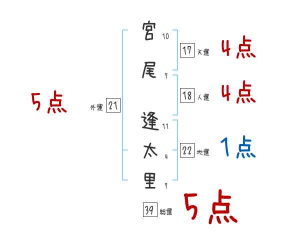 総運![]() | 宮尾逢太里さんの総運は39画の5つ星!社交性に優れ人望が厚い。人の上に立ち成功する。 あなたの人生を表す1番重要な運勢です。生涯を通じて影響する総合運となり、主に50歳以降の晩年期に影響を及ぼします。 |