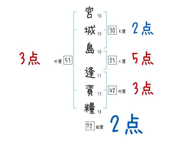 天運![]() | 宮城島逢資糧さんの天運は30画の2つ星!浮き沈みの激しさに注意しましょう。 家系が持つ宿命的な運勢を表します。祖先から受け継いだ苗字ですので自分の力が及びません。家柄を象徴します。 |