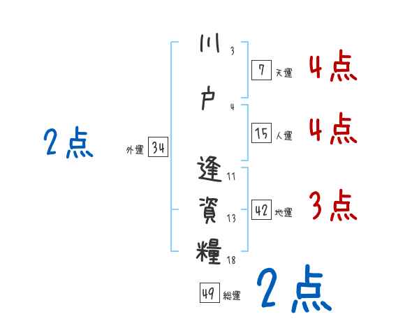 天運![]() | 川戸逢資糧さんの天運は7画の4つ星!強い意志や信念を持ち独立心が強い。自立する。 家系が持つ宿命的な運勢を表します。祖先から受け継いだ苗字ですので自分の力が及びません。家柄を象徴します。 |