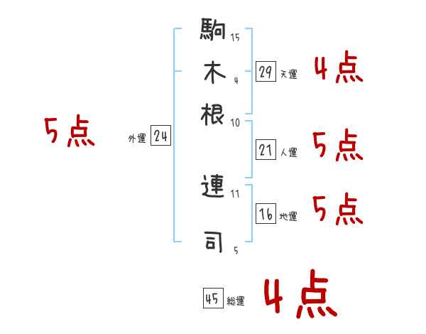 総運![]() | 駒木根連司さんの総運は45画の4つ星!もくもくと物事を進め達成する。地味な努力家。 あなたの人生を表す1番重要な運勢です。生涯を通じて影響する総合運となり、主に50歳以降の晩年期に影響を及ぼします。 |
