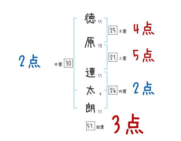 天運![]() | 徳原連太朗さんの天運は25画の4つ星!個性があり才能があふれる。強運の持ち主で発展する。 家系が持つ宿命的な運勢を表します。祖先から受け継いだ苗字ですので自分の力が及びません。家柄を象徴します。 |