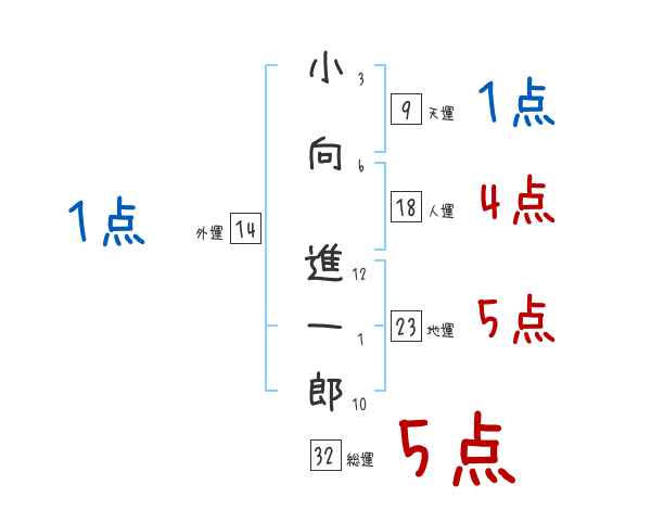 総運![]() | 小向進一郎さんの総運は32画の5つ星!柔軟性があり成功する。チャンスが多く金運が良い。 あなたの人生を表す1番重要な運勢です。生涯を通じて影響する総合運となり、主に50歳以降の晩年期に影響を及ぼします。 |