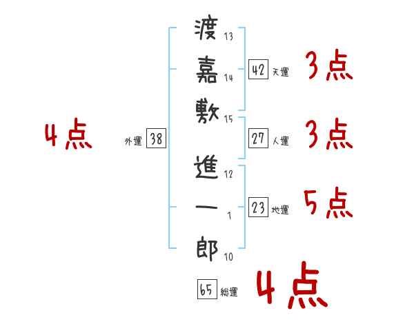 天運![]() | 渡嘉敷進一郎さんの天運は42画の3つ星!病気に注意。多芸であるが消極的でおとなしい。 家系が持つ宿命的な運勢を表します。祖先から受け継いだ苗字ですので自分の力が及びません。家柄を象徴します。 |