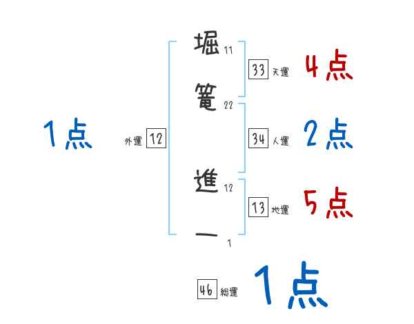 外運![]() | 堀篭進一さんの外運は12画の1つ星!簡単な失敗で諦めてしまいやすいかも。着実に行動すると良いでしょう。 生活面を象徴する運勢です。外部から受ける影響力を表し、結婚運、家庭運や職場、環境への順応性を表します。 |