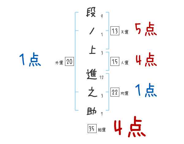 地運![]() | 段ノ上進之助さんの地運は22画の1つ星!努力することが苦手ないっぽう手先が器用。芸術性にも優れる。 個性を表す基礎的な運勢です。性格形成や対人関係、行動力など家庭環境に影響されます。主に誕生してから20歳くらいまでの若年期の運勢を表します。 |