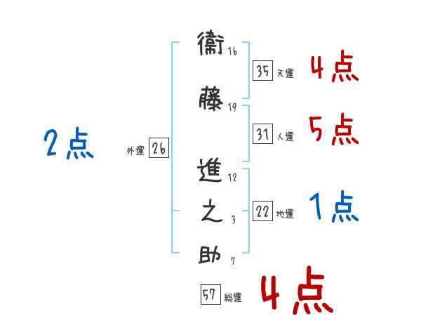 天運![]() | 衞藤進之助さんの天運は35画の4つ星!温厚な性格で感受性が高い。穏和な性格で人望が厚い。 家系が持つ宿命的な運勢を表します。祖先から受け継いだ苗字ですので自分の力が及びません。家柄を象徴します。 |