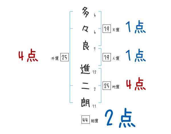 総運![]() | 多々良進二朗さんの総運は44画の2つ星!誠実で慎重な性格。物事を考えすぎないように注意しましょう。 あなたの人生を表す1番重要な運勢です。生涯を通じて影響する総合運となり、主に50歳以降の晩年期に影響を及ぼします。 |
