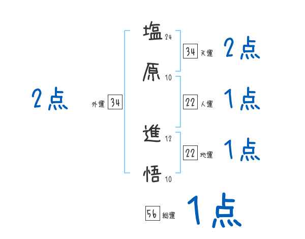 人運![]() | 塩原進悟さんの人運は22画の1つ星!努力することが苦手ないっぽう手先が器用。芸術性にも優れる。 性格や才能などを表す2番目に重要な運勢です。人間関係や協調性、社会的な成功に影響します。主に20歳から50歳ぐらいまでの中年期の運勢を表します。 |
