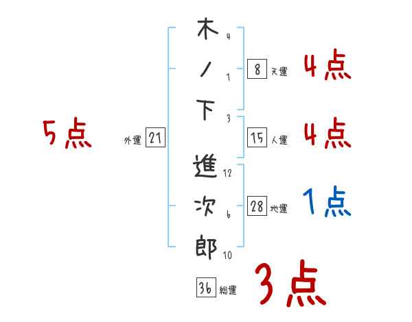 地運![]() | 木ノ下進次郎さんの地運は28画の1つ星!家庭環境に注意。スポーツで活躍できる能力があるかも。 個性を表す基礎的な運勢です。性格形成や対人関係、行動力など家庭環境に影響されます。主に誕生してから20歳くらいまでの若年期の運勢を表します。 |