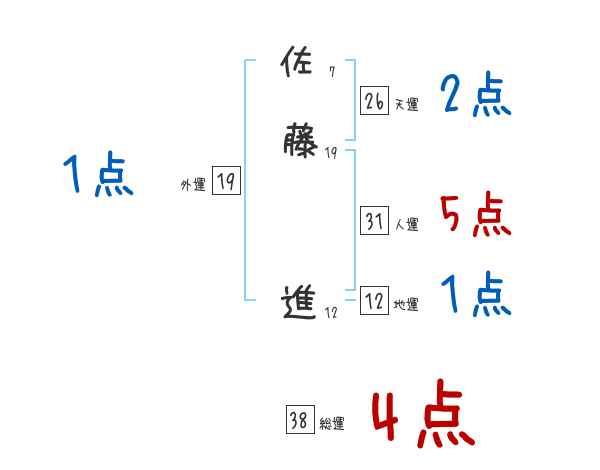 外運![]() | 佐藤進さんの外運は19画の1つ星!優れた才能を持ちますが、協調性が足りないことも。周りの人と協力する事を意識しましょう。 生活面を象徴する運勢です。外部から受ける影響力を表し、結婚運、家庭運や職場、環境への順応性を表します。 |