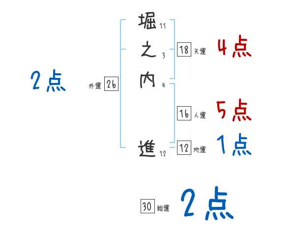 天運![]() | 堀之内進さんの天運は18画の4つ星!情熱的で剛気。忍耐力があり信頼される。 家系が持つ宿命的な運勢を表します。祖先から受け継いだ苗字ですので自分の力が及びません。家柄を象徴します。 |