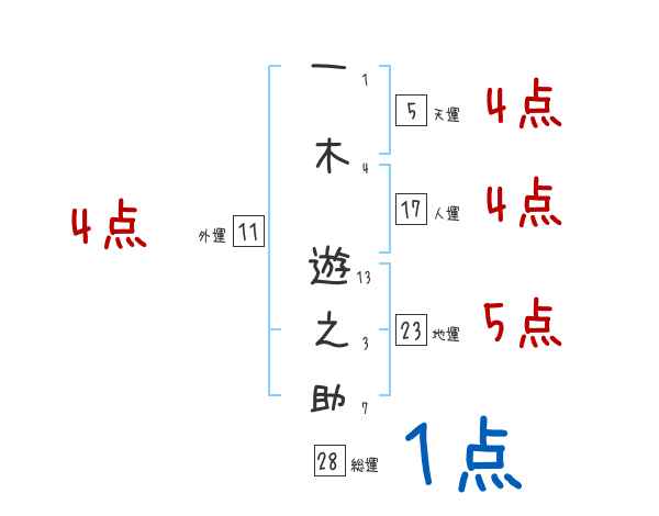 天運![]() | 一木遊之助さんの天運は5画の4つ星!健康で安泰。協調性に優れ、財産に恵まれる。 家系が持つ宿命的な運勢を表します。祖先から受け継いだ苗字ですので自分の力が及びません。家柄を象徴します。 |