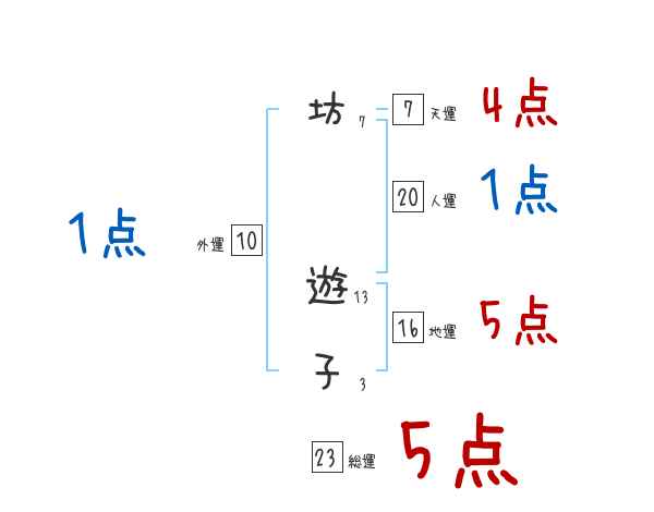 天運![]() | 坊遊子さんの天運は7画の4つ星!強い意志や信念を持ち独立心が強い。自立する。 家系が持つ宿命的な運勢を表します。祖先から受け継いだ苗字ですので自分の力が及びません。家柄を象徴します。 |