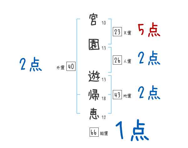 天運![]() | 宮園遊帰恵さんの天運は23画の5つ星!想像力に優れ活力がある。一代で成功し名誉を手に入れる。 家系が持つ宿命的な運勢を表します。祖先から受け継いだ苗字ですので自分の力が及びません。家柄を象徴します。 |