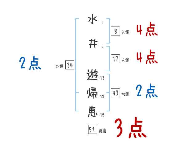 外運![]() | 水井遊帰恵さんの外運は34画の2つ星!独創性に優れるが、自尊心が強く災難に注意しましょう。 生活面を象徴する運勢です。外部から受ける影響力を表し、結婚運、家庭運や職場、環境への順応性を表します。 |