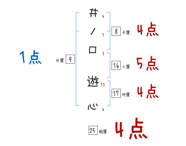 外運![]() | 井ノ口遊心さんの外運は9画の1つ星!消極的で才能を発揮することが苦手なことも。周りの意見に耳を傾けましょう。 生活面を象徴する運勢です。外部から受ける影響力を表し、結婚運、家庭運や職場、環境への順応性を表します。 |