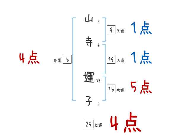 地運![]() | 山寺運子さんの地運は16画の5つ星!人望が厚く大きく発展する。逆転成功が見える。 個性を表す基礎的な運勢です。性格形成や対人関係、行動力など家庭環境に影響されます。主に誕生してから20歳くらいまでの若年期の運勢を表します。 |