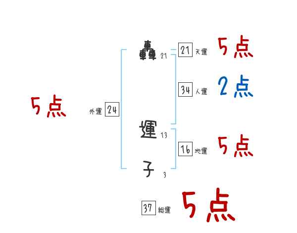 外運![]() | 轟運子さんの外運は24画の5つ星!家庭運が良く順調な人生。金運にも恵まれる。 生活面を象徴する運勢です。外部から受ける影響力を表し、結婚運、家庭運や職場、環境への順応性を表します。 |