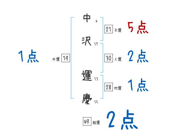 天運![]() | 中沢運慶さんの天運は21画の5つ星!統率力がある。独立し成功する。名誉を手に入れる。 家系が持つ宿命的な運勢を表します。祖先から受け継いだ苗字ですので自分の力が及びません。家柄を象徴します。 |