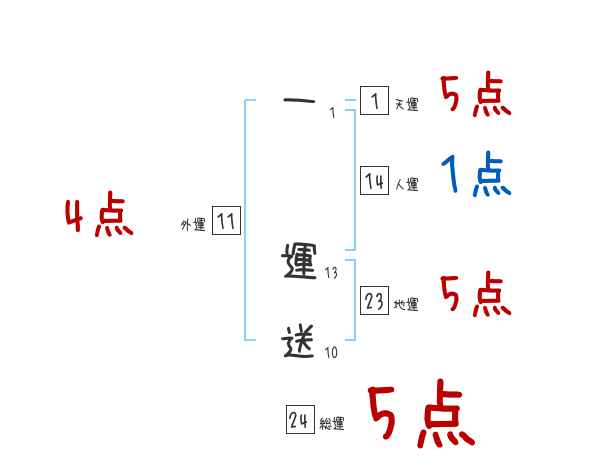 天運![]() | 一運送さんの天運は1画の5つ星!行動力、指導力があり出世し繁栄する。幸運に恵まれる。 家系が持つ宿命的な運勢を表します。祖先から受け継いだ苗字ですので自分の力が及びません。家柄を象徴します。 |