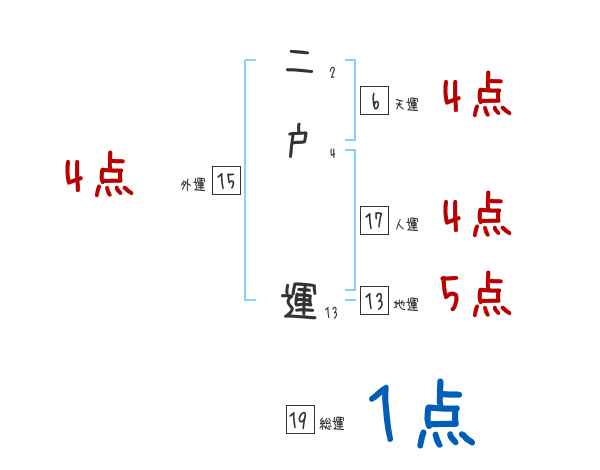 外運![]() | 二戸運さんの外運は15画の4つ星!人徳があり出世する。順調に物事を進め円満な人生。 生活面を象徴する運勢です。外部から受ける影響力を表し、結婚運、家庭運や職場、環境への順応性を表します。 |