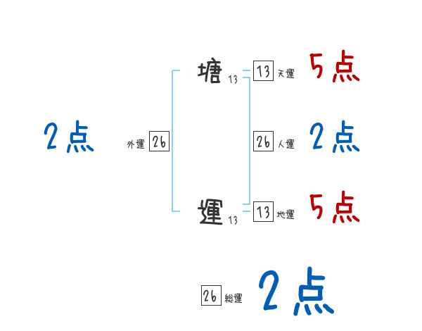 総運![]() | 塘運さんの総運は26画の2つ星!波瀾万丈かも。信頼できる人を大事にしましょう。 あなたの人生を表す1番重要な運勢です。生涯を通じて影響する総合運となり、主に50歳以降の晩年期に影響を及ぼします。 |