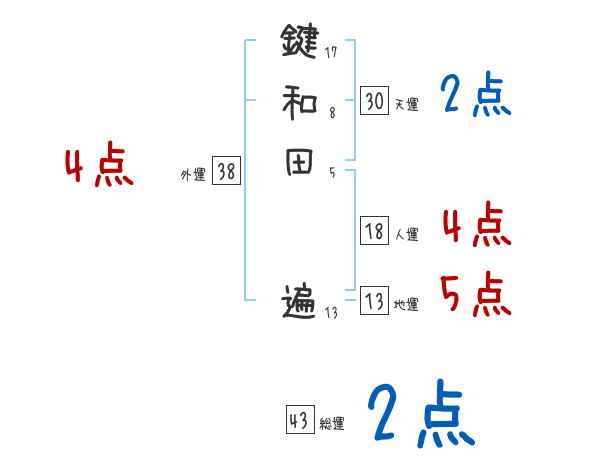 天運![]() | 鍵和田遍さんの天運は30画の2つ星!浮き沈みの激しさに注意しましょう。 家系が持つ宿命的な運勢を表します。祖先から受け継いだ苗字ですので自分の力が及びません。家柄を象徴します。 |