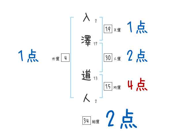 天運![]() | 入澤道人さんの天運は19画の1つ星!優れた才能を持ちますが、協調性が足りないことも。周りの人と協力する事を意識しましょう。 家系が持つ宿命的な運勢を表します。祖先から受け継いだ苗字ですので自分の力が及びません。家柄を象徴します。 |