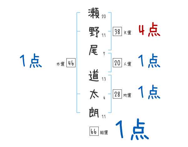 外運![]() | 瀬野尾道太朗さんの外運は46画の1つ星!迷走することが多く苦労するかも。目先のことにとらわれないように。 生活面を象徴する運勢です。外部から受ける影響力を表し、結婚運、家庭運や職場、環境への順応性を表します。 |