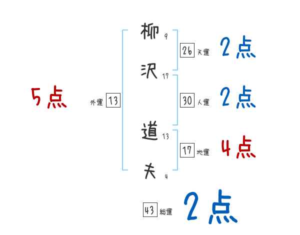 総運![]() | 柳沢道夫さんの総運は43画の2つ星!頑固な性格で独立心が強いかも。やや非現実的で浪費に注意しましょう。 あなたの人生を表す1番重要な運勢です。生涯を通じて影響する総合運となり、主に50歳以降の晩年期に影響を及ぼします。 |
