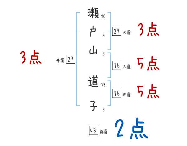総運![]() | 瀬戸山道子さんの総運は43画の2つ星!頑固な性格で独立心が強いかも。やや非現実的で浪費に注意しましょう。 あなたの人生を表す1番重要な運勢です。生涯を通じて影響する総合運となり、主に50歳以降の晩年期に影響を及ぼします。 |