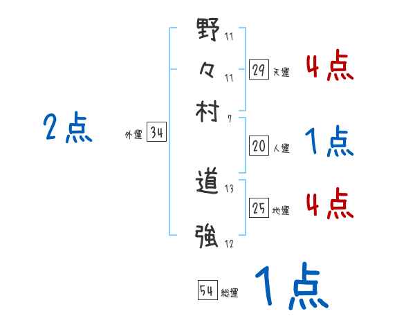 天運![]() | 野々村道強さんの天運は29画の4つ星!完全主義で才能がある。厳格な心の持ち主。 家系が持つ宿命的な運勢を表します。祖先から受け継いだ苗字ですので自分の力が及びません。家柄を象徴します。 |