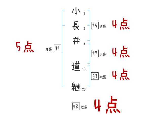 地運![]() | 小長井道継さんの地運は33画の4つ星!権力志向でプライドが高い。勇気があり運を切り開き成功する。 個性を表す基礎的な運勢です。性格形成や対人関係、行動力など家庭環境に影響されます。主に誕生してから20歳くらいまでの若年期の運勢を表します。 |