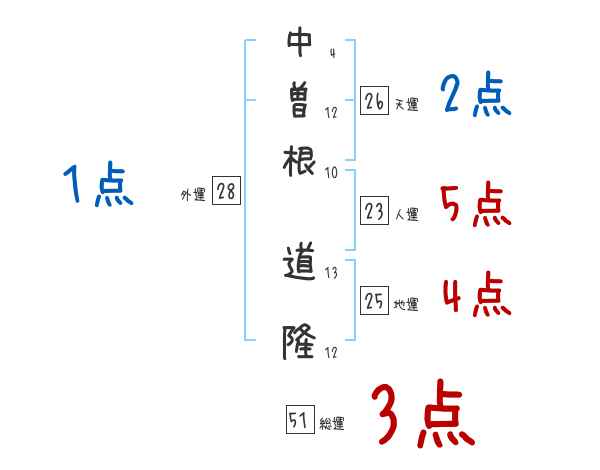 人運![]() | 中曽根道隆さんの人運は23画の5つ星!想像力に優れ活力がある。一代で成功し名誉を手に入れる。 性格や才能などを表す2番目に重要な運勢です。人間関係や協調性、社会的な成功に影響します。主に20歳から50歳ぐらいまでの中年期の運勢を表します。 |