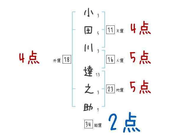 人運![]() | 小田川達之助さんの人運は16画の5つ星!人望が厚く大きく発展する。逆転成功が見える。 性格や才能などを表す2番目に重要な運勢です。人間関係や協調性、社会的な成功に影響します。主に20歳から50歳ぐらいまでの中年期の運勢を表します。 |