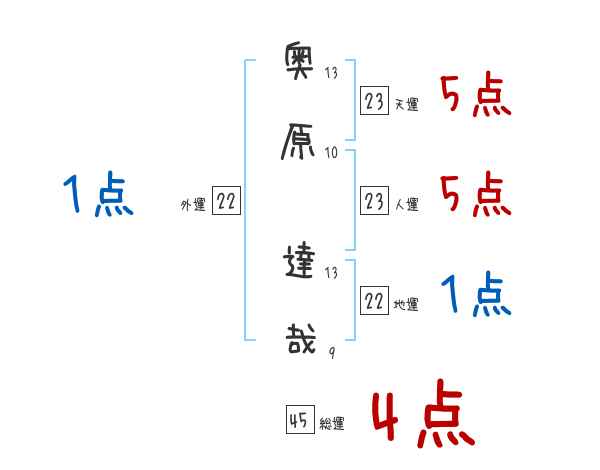天運![]() | 奥原達哉さんの天運は23画の5つ星!想像力に優れ活力がある。一代で成功し名誉を手に入れる。 家系が持つ宿命的な運勢を表します。祖先から受け継いだ苗字ですので自分の力が及びません。家柄を象徴します。 |