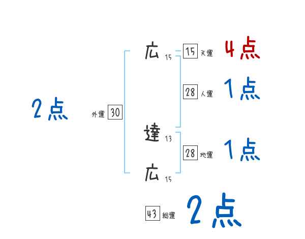 総運![]() | 広達広さんの総運は43画の2つ星!頑固な性格で独立心が強いかも。やや非現実的で浪費に注意しましょう。 あなたの人生を表す1番重要な運勢です。生涯を通じて影響する総合運となり、主に50歳以降の晩年期に影響を及ぼします。 |