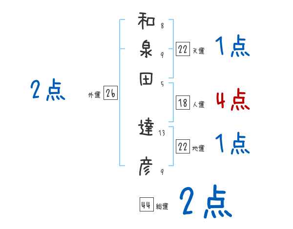 総運![]() | 和泉田達彦さんの総運は44画の2つ星!誠実で慎重な性格。物事を考えすぎないように注意しましょう。 あなたの人生を表す1番重要な運勢です。生涯を通じて影響する総合運となり、主に50歳以降の晩年期に影響を及ぼします。 |