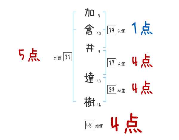 天運![]() | 加倉井達樹さんの天運は19画の1つ星!優れた才能を持ちますが、協調性が足りないことも。周りの人と協力する事を意識しましょう。 家系が持つ宿命的な運勢を表します。祖先から受け継いだ苗字ですので自分の力が及びません。家柄を象徴します。 |