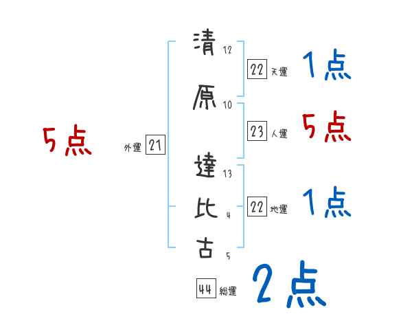 地運![]() | 清原達比古さんの地運は22画の1つ星!努力することが苦手ないっぽう手先が器用。芸術性にも優れる。 個性を表す基礎的な運勢です。性格形成や対人関係、行動力など家庭環境に影響されます。主に誕生してから20歳くらいまでの若年期の運勢を表します。 |