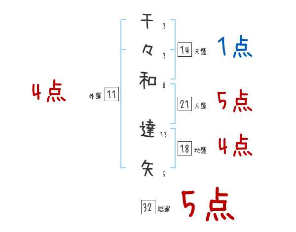 総運![]() | 千々和達矢さんの総運は32画の5つ星!柔軟性があり成功する。チャンスが多く金運が良い。 あなたの人生を表す1番重要な運勢です。生涯を通じて影響する総合運となり、主に50歳以降の晩年期に影響を及ぼします。 |