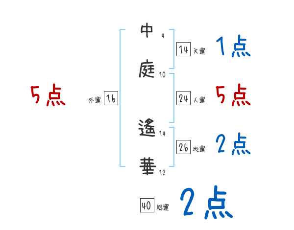 天運![]() | 中庭遙華さんの天運は14画の1つ星!人に対して優しいがストレスを溜め込みがち。人間関係のトラブルを避けるよう気をつけましょう。 家系が持つ宿命的な運勢を表します。祖先から受け継いだ苗字ですので自分の力が及びません。家柄を象徴します。 |