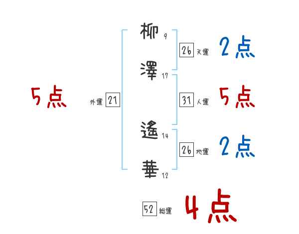 外運![]() | 柳澤遙華さんの外運は21画の5つ星!統率力がある。独立し成功する。名誉を手に入れる。 生活面を象徴する運勢です。外部から受ける影響力を表し、結婚運、家庭運や職場、環境への順応性を表します。 |