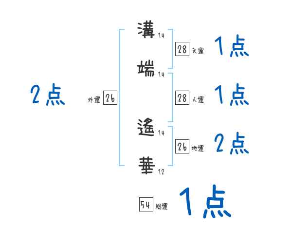 天運![]() | 溝端遙華さんの天運は28画の1つ星!家庭環境に注意。スポーツで活躍できる能力があるかも。 家系が持つ宿命的な運勢を表します。祖先から受け継いだ苗字ですので自分の力が及びません。家柄を象徴します。 |