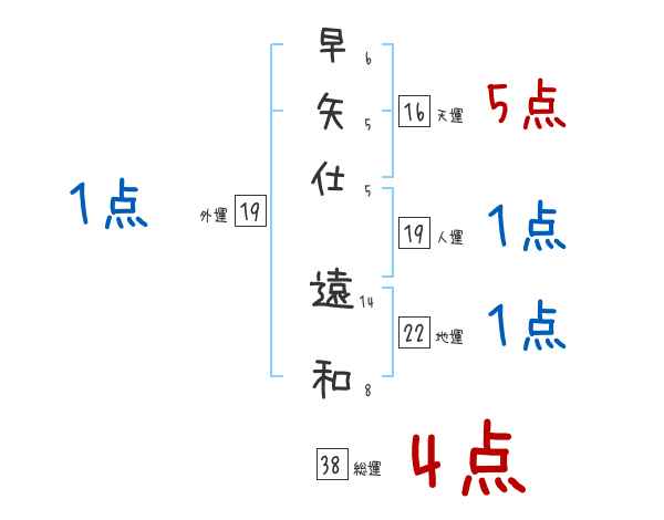 天運![]() | 早矢仕遠和さんの天運は16画の5つ星!人望が厚く大きく発展する。逆転成功が見える。 家系が持つ宿命的な運勢を表します。祖先から受け継いだ苗字ですので自分の力が及びません。家柄を象徴します。 |