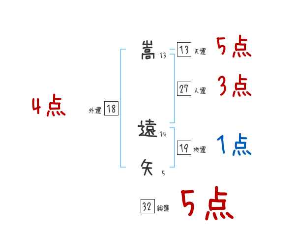 総運![]() | 嵩遠矢さんの総運は32画の5つ星!柔軟性があり成功する。チャンスが多く金運が良い。 あなたの人生を表す1番重要な運勢です。生涯を通じて影響する総合運となり、主に50歳以降の晩年期に影響を及ぼします。 |