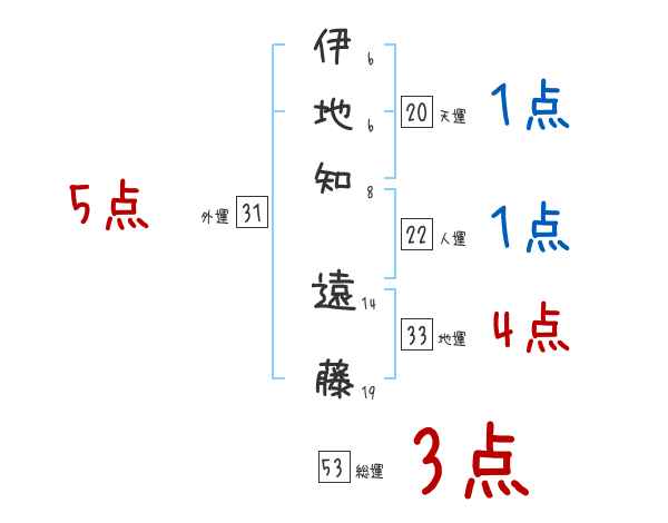 総運![]() | 伊地知遠藤さんの総運は53画の3つ星!やや見栄っ張りで虚栄心がある。散財に注意。 あなたの人生を表す1番重要な運勢です。生涯を通じて影響する総合運となり、主に50歳以降の晩年期に影響を及ぼします。 |