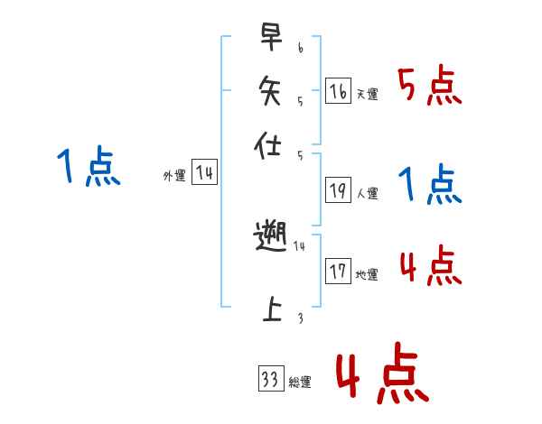 外運![]() | 早矢仕遡上さんの外運は14画の1つ星!人に対して優しいがストレスを溜め込みがち。人間関係のトラブルを避けるよう気をつけましょう。 生活面を象徴する運勢です。外部から受ける影響力を表し、結婚運、家庭運や職場、環境への順応性を表します。 |